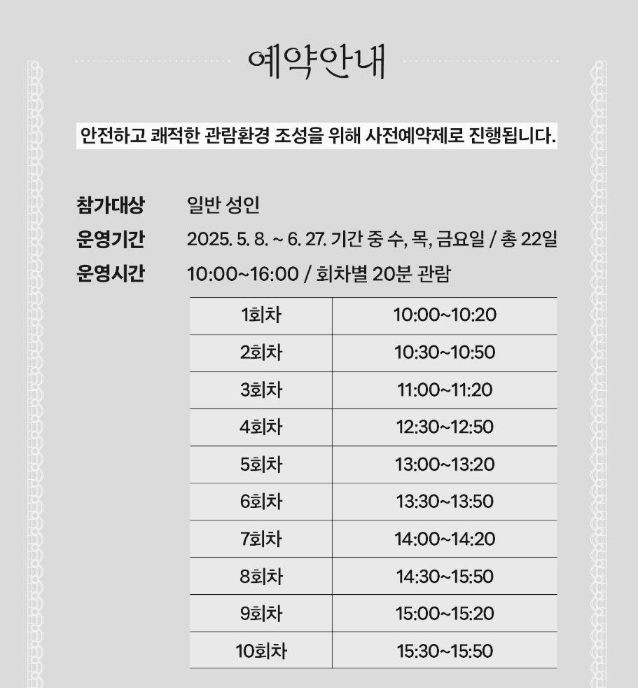 관람 기간은 2025년 5월 8일부터 6월 27일까지이며, 매주 수~금요일만 운영됩니다.