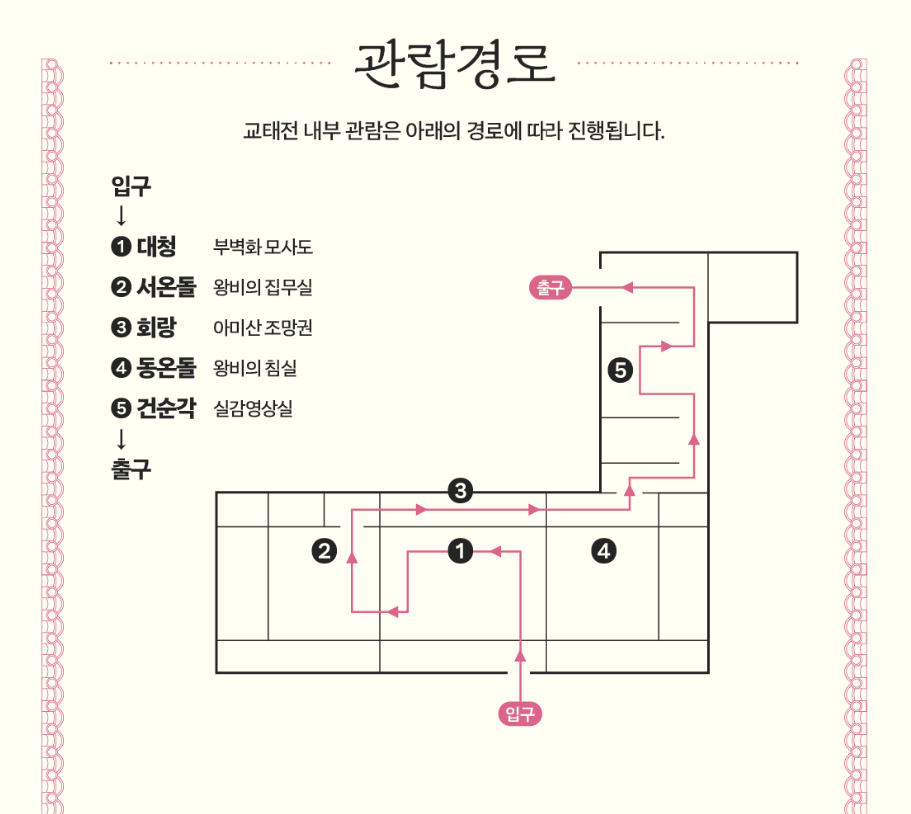 입구는 근정전 뒤편이며, 왕비의 생활 공간을 따라 이동하게 됩니다.