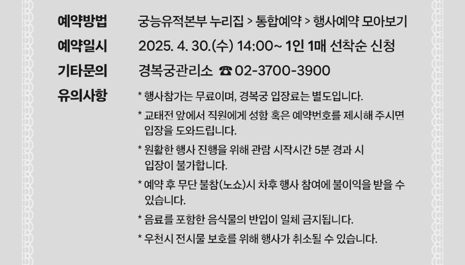- 예약은 무료이나, 경복궁 입장료(3,000원)는 별도