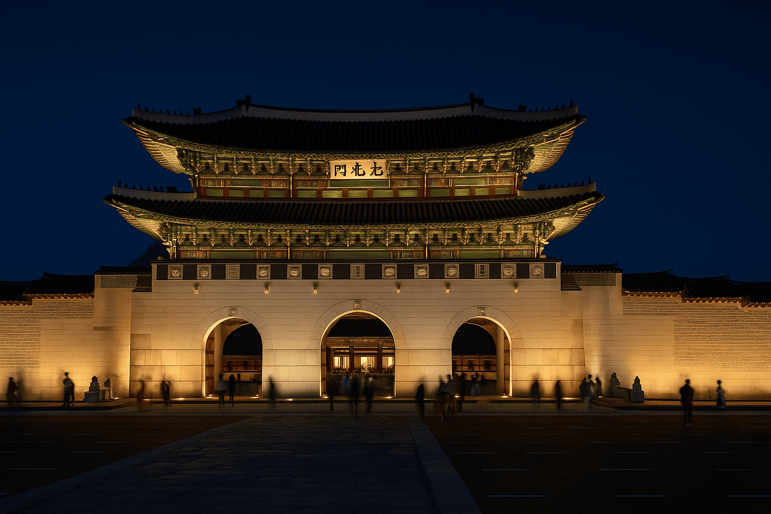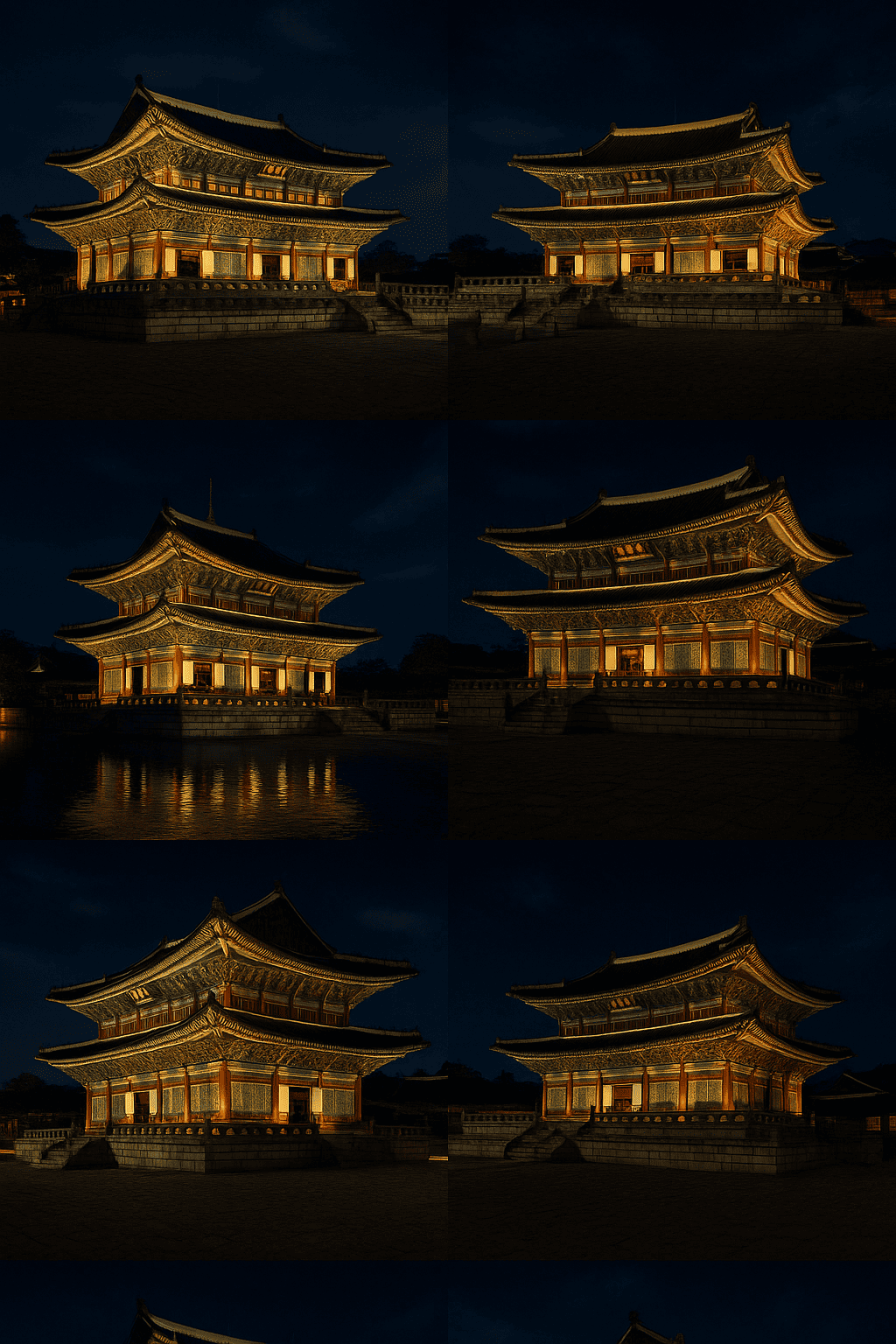 고요한 밤, 경복궁의 전각들이 조명에 밝혀지며 마치 시간이 멈춘 듯한 분위기를 연출합니다.