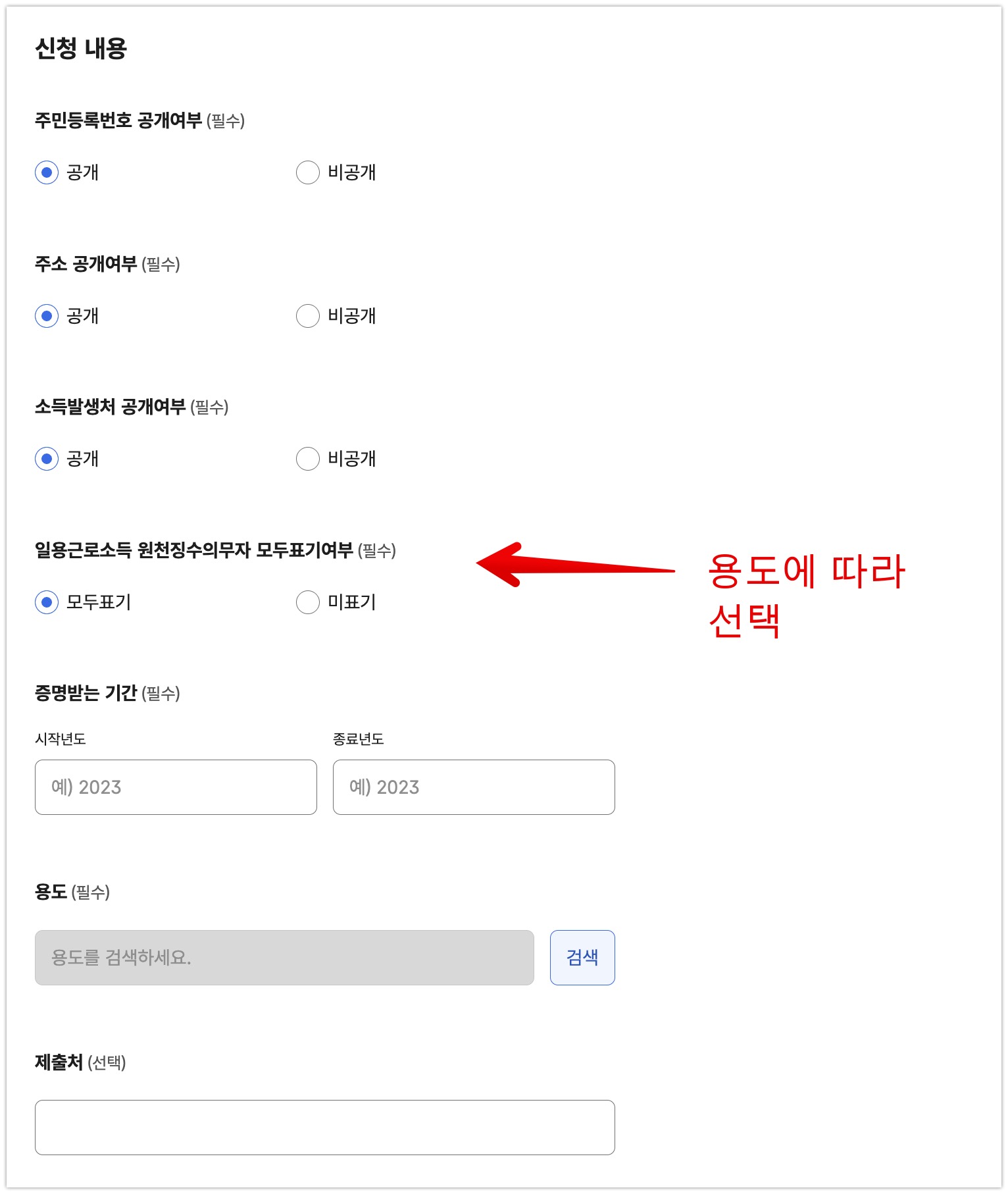 • 용도 선택 (예: 금융기관 제출용, 학교 제출용 등)