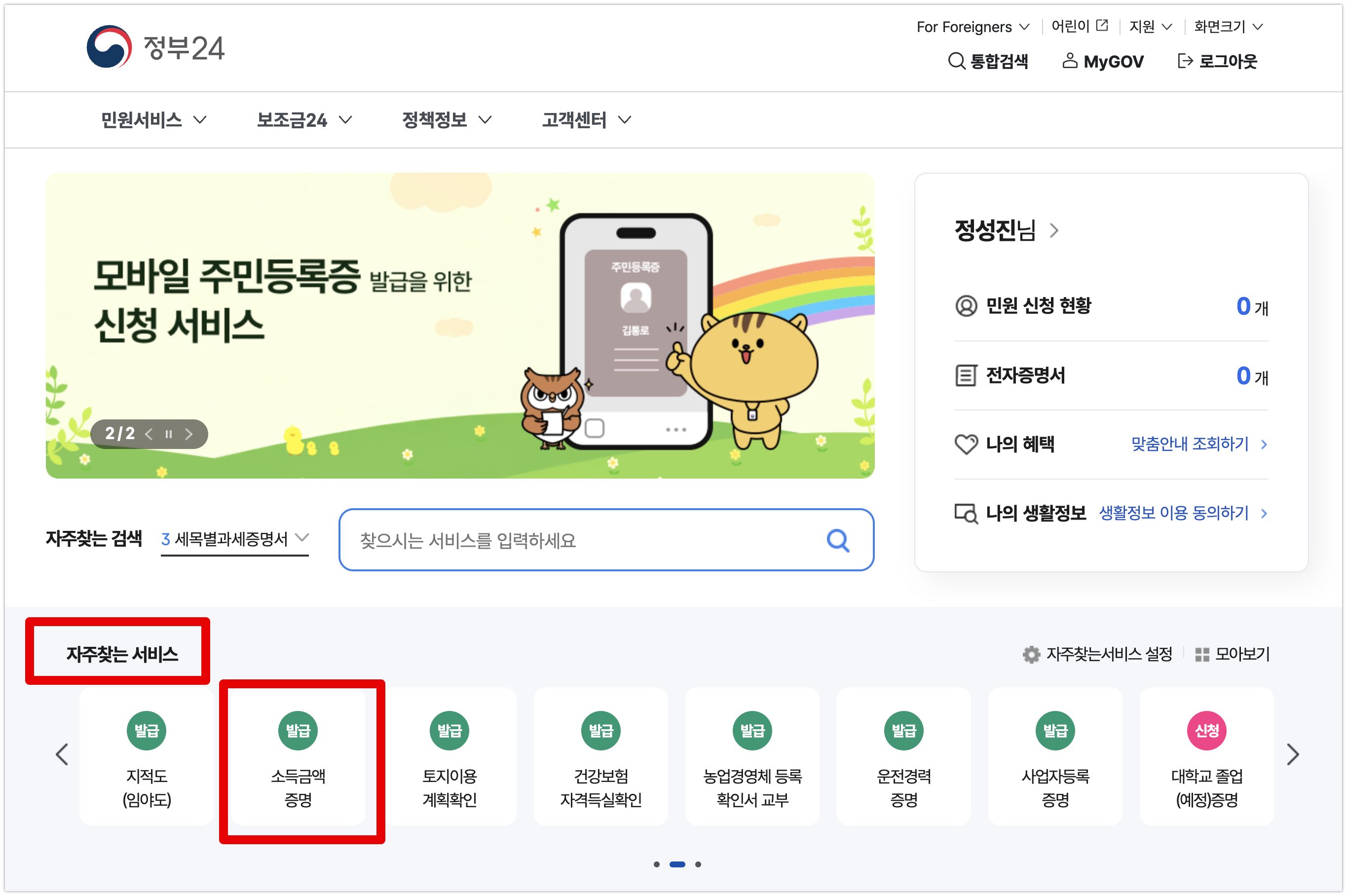2. 자주찾는 서비스 > 소득금액증명 메뉴 선택