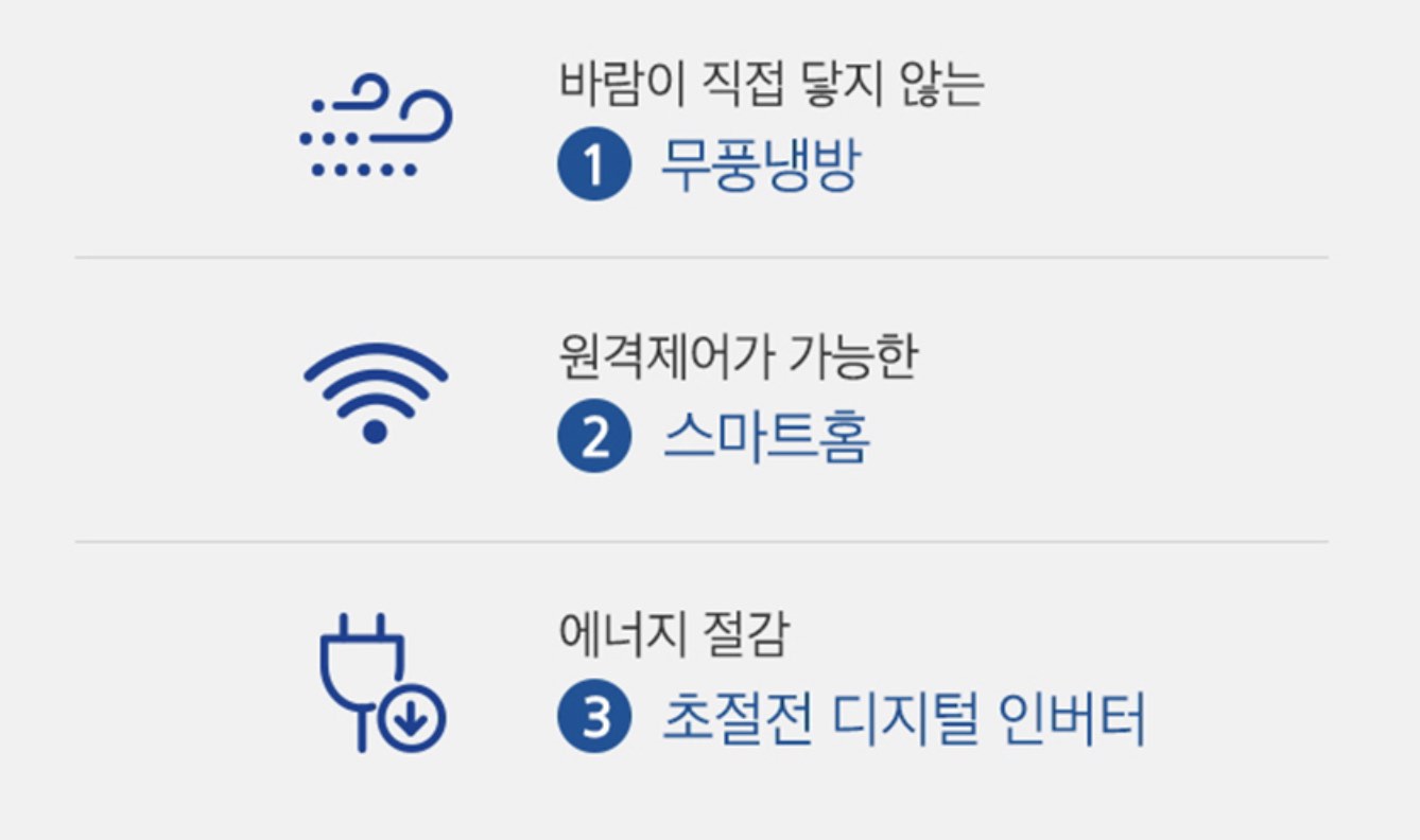 • 특징: 무풍 냉방, AI 절전모드, IoT 연동