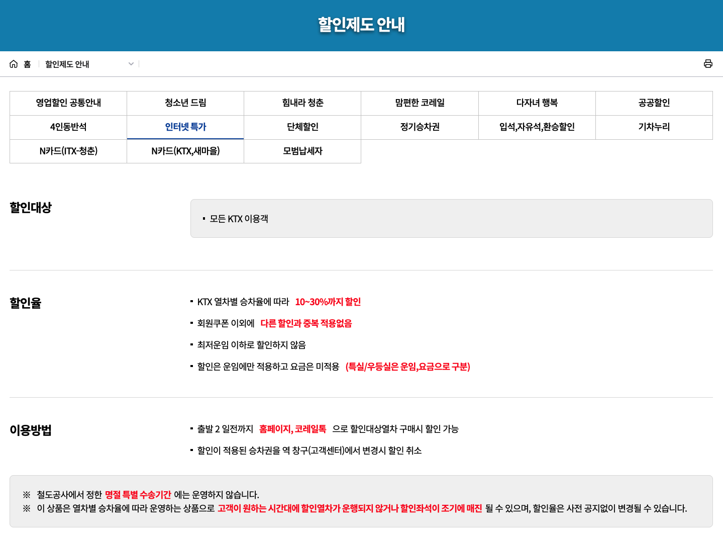 • KTX 조기 예매 할인: 3~14일 전 예매 시 최대 30% 할인.